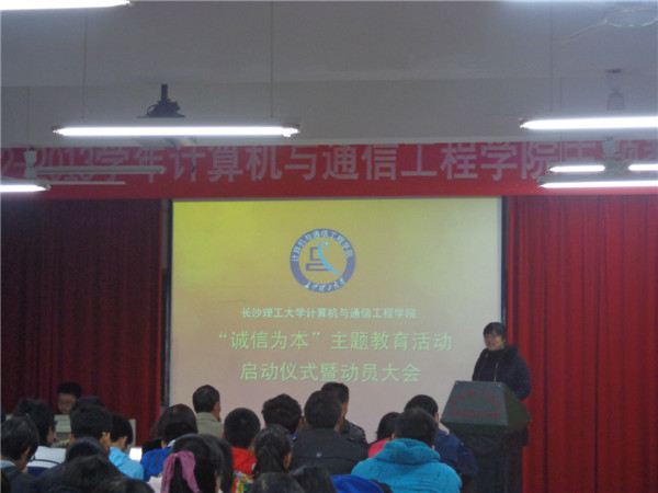 1115日晚,”诚信为本主题教育启动仪式暨动员大会在理科楼B311顺利召开。出席的领导有院党委副书记方碧波,关工委副主任雷理成,学工办主任任志祥,分团委书记肖苹宁及学院学生代表。