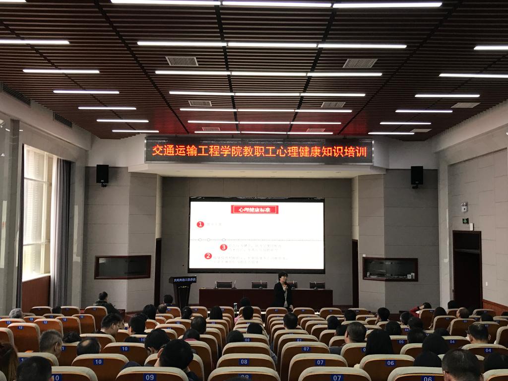 10月20日下午2点,交通运输工程学院在工二B301报告厅举行全院教职工心理健康知识培训会。培训会上,学校心理健康教育中心主任龚勋作了题为《心理健康漫谈(专任教师篇)》的心理育人知识讲座。学院党委书记孔伟红、院长钱国平以及全院教职工参加了此次培训。