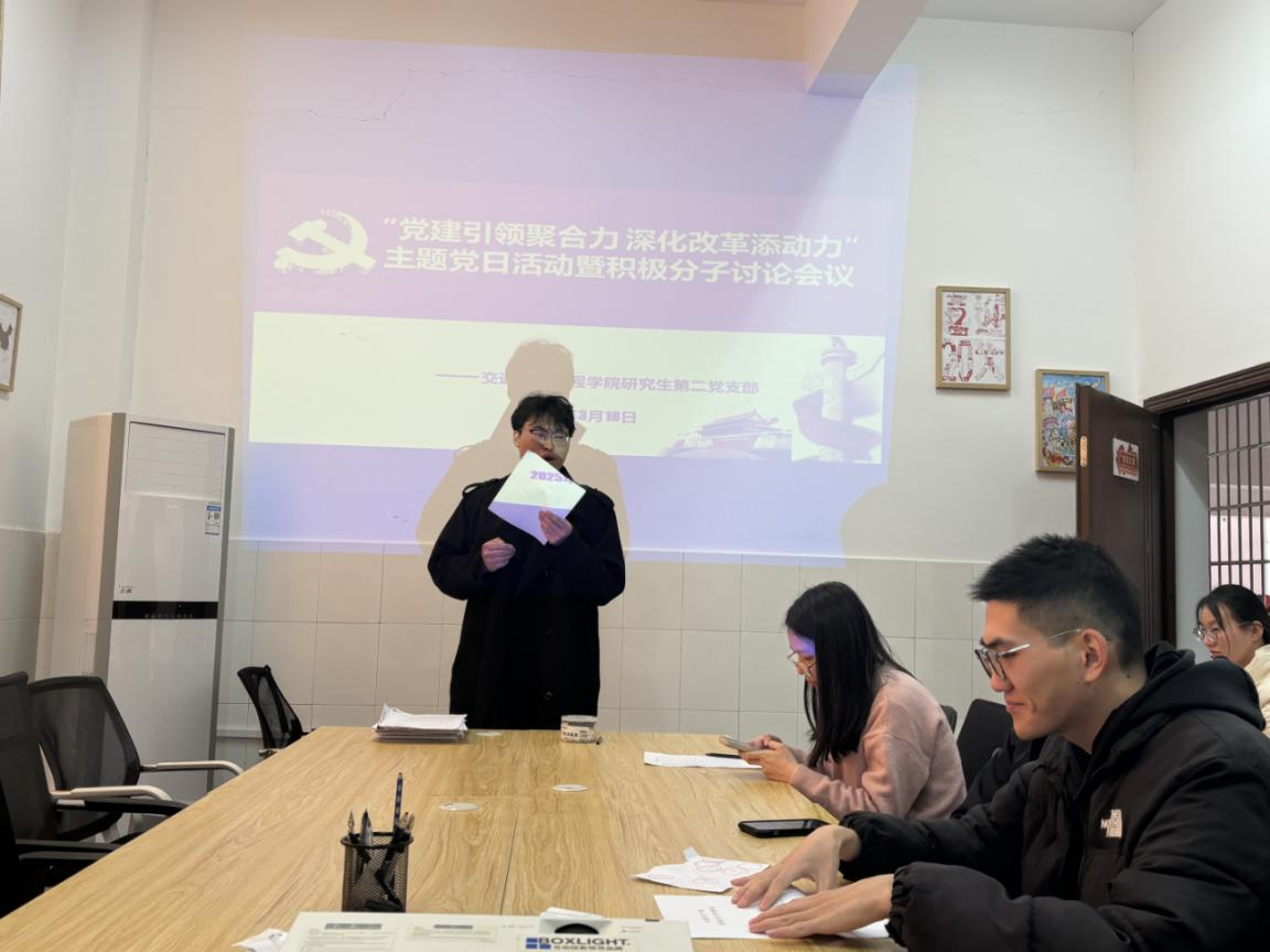 为进一步规范党员发展流程,扎实做好党员培养教育工作,切实提升党组织凝聚力与战斗力,近日,MG冰球突破官网交通学院研究生第二党支部于学院会议室召开入党积极分子讨论大会。支部全体党员、入党积极分子齐聚一堂,会议在庄重而热烈的氛围中拉开帷幕,由党支部书记肖梦泽主持。