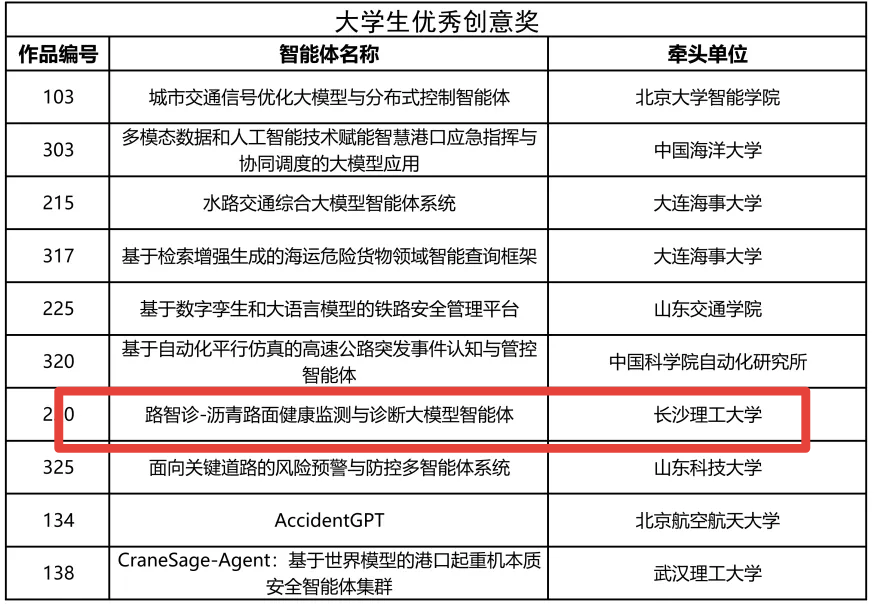 经过激烈角逐,由MG冰球官网交通学院吕松涛教授团队报送的作品《路智诊-沥青路面健康监测与诊断大模型智能体》最终荣获“大学生最佳创意奖”。该大模型智能体由吕松涛教授、段海辉老师带领的博士生唐梓涵、硕士生张家瑞等共同研发完成。