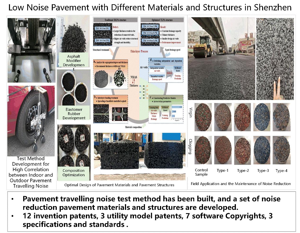 (1) Investigated the sound propagation and energy dissipation mechanisms of tire-road interactions under the coupling effects of multiple environmental media and developed a broadband sound absorption and targeted energy dissipation technology for comprehensive roadside noise reduction, resulting in integrated mitigation strategies for different noise control requirements. (2) Developed a heat-insulating and cooling functional layer for asphalt road surfaces and its combined design methods, revealing the composite system/interface properties, energy transfer and conversion mechanisms of asphalt mixtures; and invented a temperature-adjusting functional road surface design method and effect detection technology, which effectively alleviated thermal effects of the road surface temperature field and achieved comprehensive temperature control of road surfaces. (3) Established a comprehensive treatment technology for vehicle emission by using adsorption-degradation coordination and solved multi-source pollution problems for road near-surface, achieving the efficient and comprehensive treatment for emissions under complex urban road application scenarios.