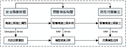 通过查阅和研究BIM技术和智慧高速公路施工安全管理相关的期刊文献,并运用Citespace科学计量和Nvivo质性编码,系统认知目前BIM技术在国内外的应用现状,尤其是BIM技术在高速公路施工安全隐患管理方面的应用程度,识别出高速公路施工安全管理的主要隐患,基于BIM技术构建智慧高速公路施工安全隐患预警体系,并制定智慧高速公路施工安全隐患防范对策,为全面加强高速公路施工安全管理提供理论参考及实践指导,具体项目研究路线如下图3所示。