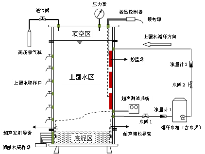 装置主体采用直径为100 cm的有机玻璃柱,以便观察、取样和分析。装置自上至下由法兰连接依次分为顶空区、上覆水区和底泥区,各自高度分别为30 cm、200 cm和30 cm(其中,底泥区投放底泥厚度为25 cm,剩余5 cm投加上覆水,以便于装置拆卸后进行泥水微界面特性测试分析)。模拟装置所用上覆水和底栖动物均采自长沙综合枢纽主库区消落带,其中底栖动物为消落带的优势种属。配套装置包括温度控制系统、压力控制系统、上覆水与间隙水分层采集系统和上覆水循环系统。其中温度控制系统和压力控制系统联用可实现控温“淹水-落干”循环,用于模拟不同的枢纽调度运行方案。
