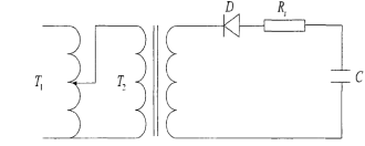 电抗器匝间绝缘试验装置中,由充电回路把电网的电能通过调压器、高压变压器、高压整流珪堆、限流电阻,送到电容器中储存起来,这就是电容器的充电过程。最简单的充电回路是由调压器TI、试验变压器T2、高压桂堆D、保护电阻RS以及充电电容C组成。充电回路是将电网中的交流电通过整流之后,送入电容器C中储存起来。用脉冲电压法进行电抗器匝间过电压试验时,采用正极性冲击电压对试品进行绝缘考核时,拟采用的试验充电电路如图2所示: