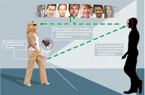 数据库装载在盲杖里一张SD卡中,内有盲杖使用者的亲戚朋友、老师医生等一应熟人的照片资料。来人的脸一旦与照片库有匹配,盲杖判定有熟人靠近,它就会振动报告。盲杖借助蓝牙,与使用者的耳机连接,报告是谁来了。更特别的是,盲杖还会在GPS的辅助下,为使用者导航,一步一步向熟人靠近。