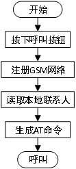 紧急呼叫功能的实现流程如图15所示。首先对该模块进行初始化,当检测到通话按键被按下时,模块首先需要注册GSM网络,然后查询本地数据库中的联系人,生成AT命令,最后通过RS232串口发送给GSM模块,完成呼叫。