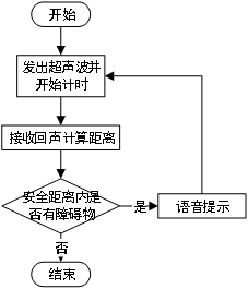 使用此模块时,超声波发射器会发出超声波,从发出时计时器开始计时,在接触到障碍物时返回,此时接收器接收到返回的超声波信号,计时器停止计时,由声音在空气中传播的速度就可测出此时盲杖距离前方障碍物的距离。根据设定的报警标准,当距离障碍物较近时就会得到报警信号。报警流程如图13所示。