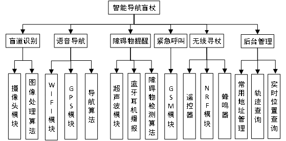 智能导航盲杖以盲道识别功能为核心,包括语音导航、障碍物提醒、紧急呼叫、无线寻杖、后台管理五大功能。其中,盲道识别功能以盲杖所嵌入的摄像头为基础,通过采集路面(含盲道)图像信息,利用图像识别算法在对图像中的盲道进行检测和识别,以便进一步为盲人提供精准的导航服务;语音导航功能在利用GPS模块与WIFI相结合进行精确定位的基础上,通过内置地图提供的接口计算导航路线,进而结合盲道识别功能为盲人实现精确导航;障碍物提醒功能通过超声波模块检测障碍物,并实时测距,进而通过蓝牙耳机及时播报提醒盲人,以保障盲人的行走安全;紧急呼叫功能通过GSM模块支持与监护人或常用联系人的及时通信,同时也方便盲人在遇到突发状况时,能在第一时间与监护人取得联系;无线寻杖功能采用NRF模块,通过随身携带的遥控器控制盲杖发出声响,以确定盲杖位置,从而快速找到盲杖;后台管理模块负责接收并管理盲杖的实时状态数据,为监护人提供盲人的实时位置、历史轨迹等信息,此外还可提供常用地址管理。