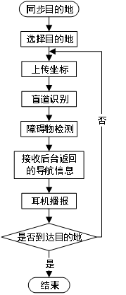 在需要导航的时候,视障人士通过按键选择盲杖中从服务端同步的常用目的地,按下导航键开始导航;主控芯片将GPS获取的位置信息以及导航相关命令信息等通过连接的wifi热点以HTTP的方式上传到服务端。服务端收到目的地后,请求导航地图API,得到导航信息,根据上传的位置信息给出相应的回应,盲杖则将行走指令通过蓝牙耳机播放,到达目的地后,盲杖会提示导航结束。语音导航流程如图14所示。
