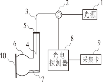 附图标记:1、光源;2、三端口环形器;3、引导光纤;光纤端面4、;5、小号振动膜片;6、声波收集装置;7、高反射膜;8、光电探测器;9、采集卡;10、大号振动膜片。