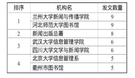 2.农家书屋研究机构分析:共涉及500余家,其中400余家机构发文仅1篇,发表 5篇及以上的文献机构如下表。