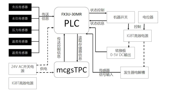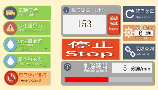 在人机交互计划采用mcgsTpc人机交互界面大屏幕LCD彩色触摸屏,监测系统由MCGS(HMI)软件组态,用于监控除碳的系统运行过程(汽油车除碳,柴油车除碳)。装有MCGS通用版系统软件,7寸的HMI画面,可实时监控负压信号、发生器压力、发生器液位、副水箱液位及各种变量的变化,系统有几个画面组成:系统总览画面、汽油车除碳主操作画面、柴油车除碳主操作画面、故障查询画面(包括车辆未准备好、发生器压力高、副水箱液位低、泵已停止运行、发生器液位低)、在线技术查询画面、计数查询画面,使操作员方便的监控除碳系统的运行。