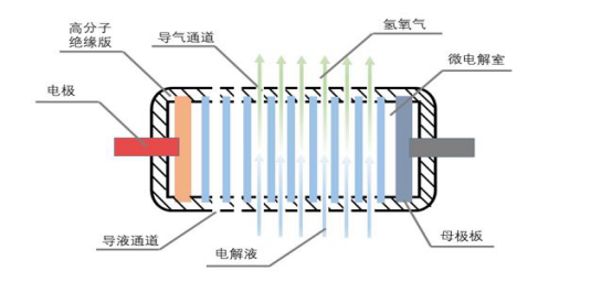 采用了气液对流通道的设计从而减少了在极板上附着的气泡与发生器顶端聚集的气体,加快了电解液的流动补充速度与有效电解面积。大大提高了电解效率,和现有的水氢气体发生器相比可以用更小的电解极板面积达到更高的产气效率