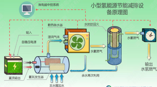 本项目通过对小型氢能源节能减排设备的设计,通过水氢发生器产生水氢气体,通入发动机中混合燃烧,从而达到节能减排的效果。