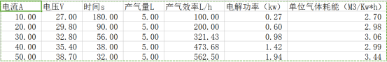 在本次试验中,试验机最大产气量为562L/h,最小产气量为100L/h, 在100L/h时单位气体耗能最少仅需2.70千瓦时即可产1立方水氢气体,仅为市面上最小功耗的70%。在产气量为562L/h时耗能最大,需3.44千瓦时可产1立方米水氢气体,为市面上最小功耗的86%。相比温州高企能源科技有限公司的CHG-1型机器,试验机可以达到节能60.4%的效果。