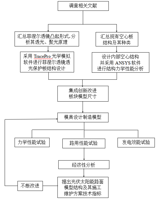 项目前期已对增强自密实混凝土的路用性能及强度进行研究,优化自密实混凝土的配合比,并配制出可自行流动成型,无需振捣即可密实填充模具各个角落的自密实混凝土。在此基础上我们将设计一种更为合理的基于菲涅尔透镜的光伏太阳能路面空心板块结构单元,利用力学知识以及ANSYS有限元分析软件,拟定合理的板块模型尺寸,同时设计菲涅尔透镜聚光板块及其凸起设计,利用光学知识以及TracePro光学模拟软件对菲涅尔透镜聚光原理进行分析,得到菲涅尔透镜的结构参数及透光、聚光性能并对其抗滑性能进行研究。对光伏太阳能路面空心板块结构进行优化,设计模具并对其施工维护方案进行研究。最后通过制作实体模型,进行板块应用于工程实践的可行性分析。使其满足路用性能的同时有良好聚光能力和抗滑性能且便于施工维护。