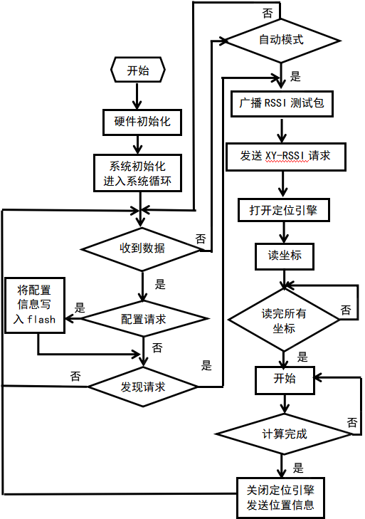 盲节点是随身携带的设备(RFD),电池供电。遇到突发情况时,打开设备上的电源开关,只要是在Zigbee网络的覆盖区域内,立即向周围节点广播请求25个数据包,以获得RSSI强度。然后发送XY—RSSI请求,根据周围节点响应的信息,计算出当前自身所处坐标,将包含此坐标的信息和临近参考节点的坐标组成数据帧发送到协调器。图4为盲节点的自动模式下,定位功能的程序流程图。