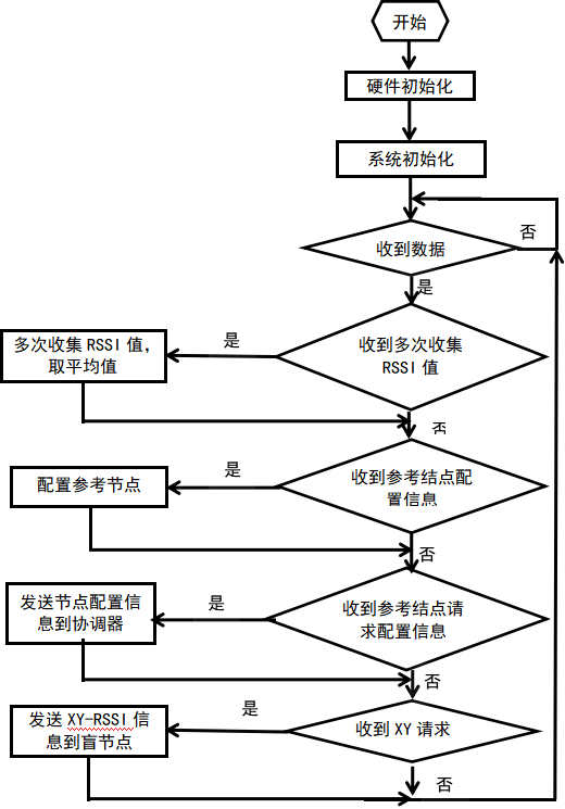 参考节点是网络的主体,通常是按照一定的距离要求,根据实际的环境布置在该区域内,组成无线通信网络,为在其有效覆盖范围内的盲节点提供所需的定位信息。打开电源之后,参考节点即向协调器发送请求加入网络的信息,并报告自己的配置信息;当有盲节点发来请求时,即处理盲节点的请求信息。图3为参考节点程序流程图。
