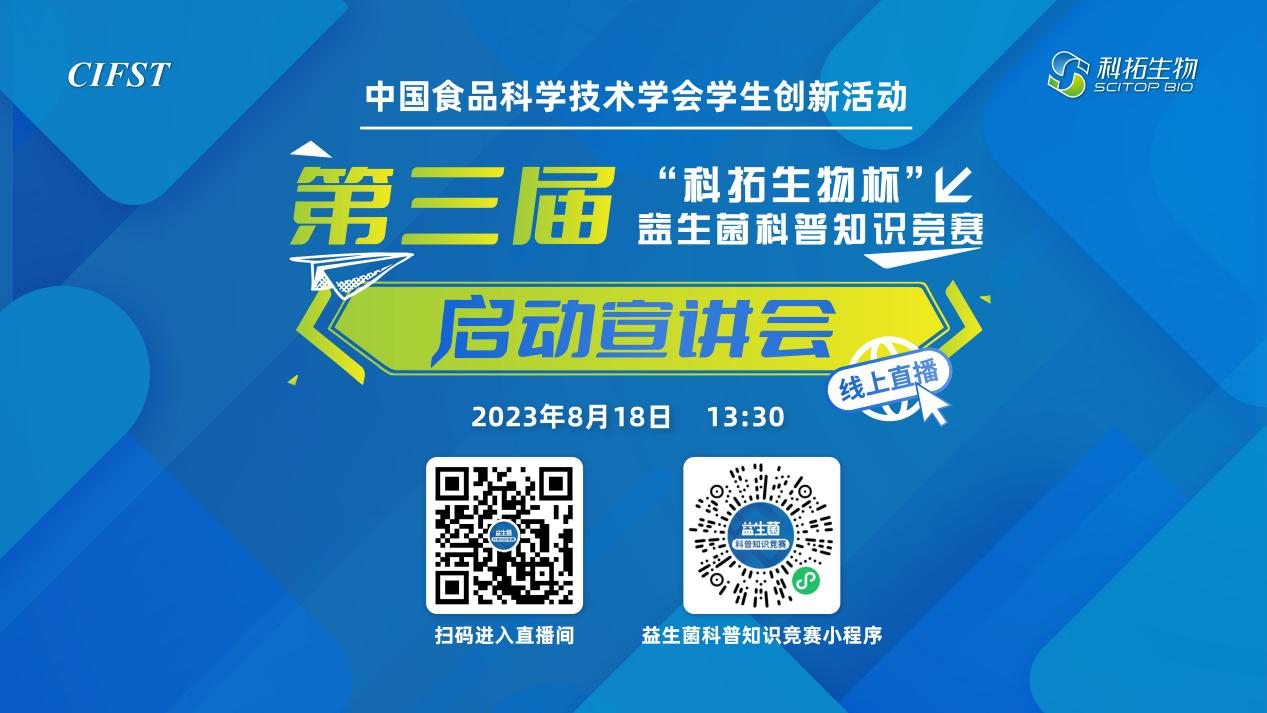 随着益生菌的健康作用受到全社会的广泛关注,益生菌科研与产业也迎来快速发展的机遇期。为科学普及益生菌知识,激发在校大学生对益生菌的学习热情,促进师生之间的人文交流,助力院校益生菌的相关专业教学,助力更多青年人才成长,为益生菌产业的未来储备力量。2023年,中国食品科学技术学会与北京科拓恒通生物技术股份有限公司,共同举办中国食品科学技术学会第三届“科拓生物杯”益生菌科普知识竞赛。