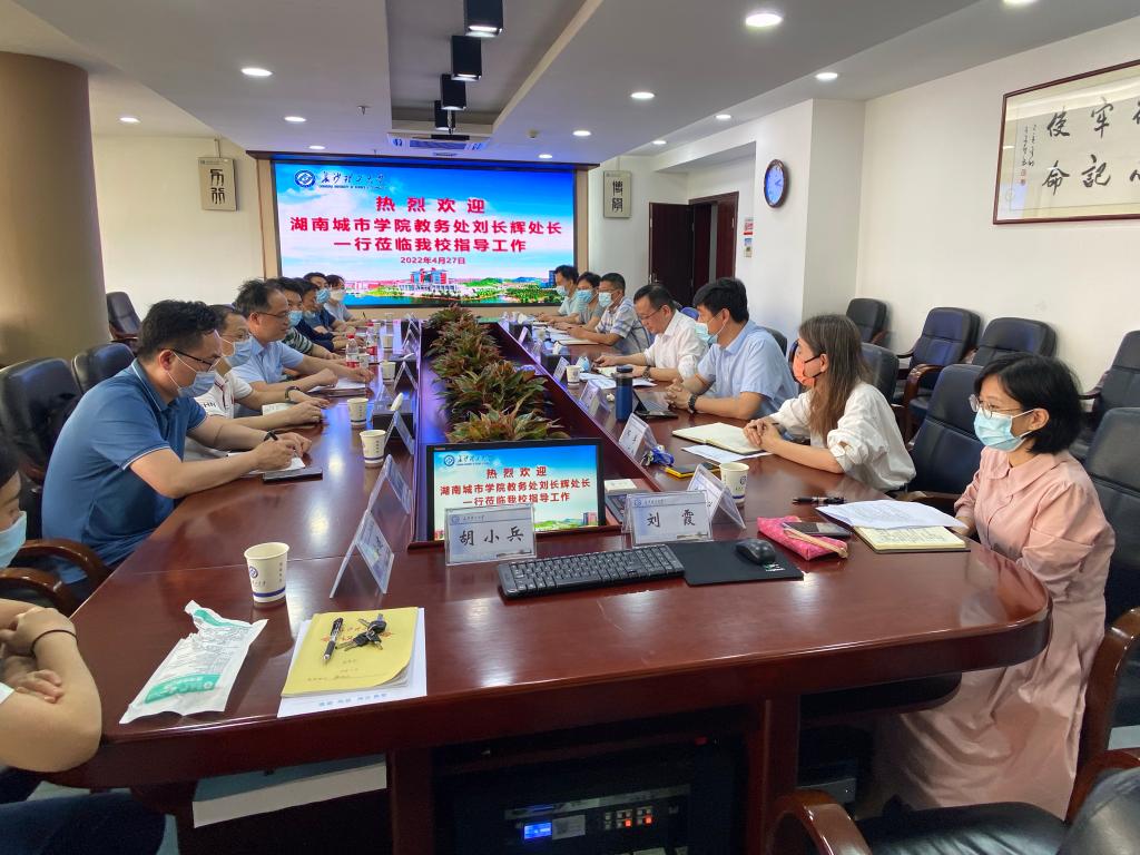 4月27日下午,湖南城市学院教务处来MG冰球官网调研,教务处处长刘思强、副处长李平、彭晖、邓丰在一办公楼六会议室热情接待了刘长辉处长一行,教务处全体科长参加了调研会。
