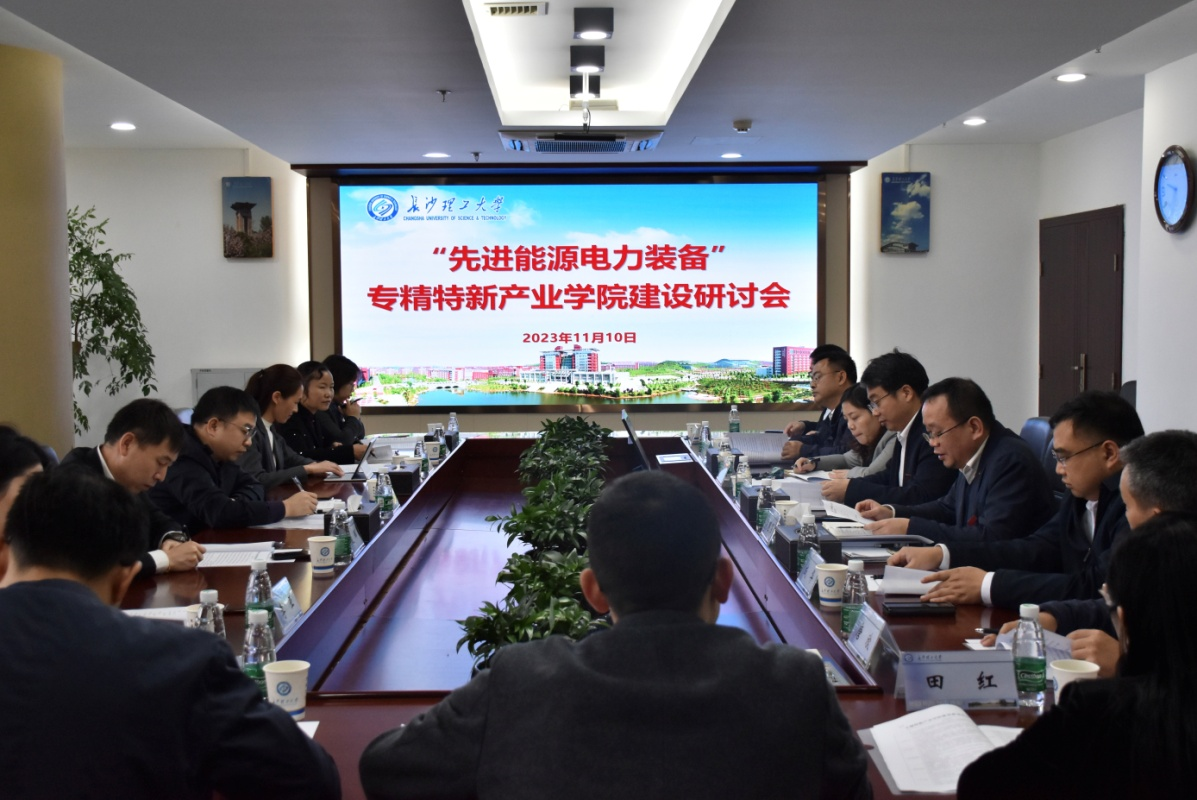 11月10日上午,先进能源电力装备专精特新产业学院建设研讨会在MG冰球突破官网一办公楼五会议室召开。来自长沙市中小企业发展中心、湘能楚天电力科技有限公司、中车株洲电力机车研究所有限公司、湖南九九智能环保股份有限公司、湖南先步信息股份有限公司、湖南省智能电力设备产业技术创新战略联盟等单位负责人参加会议,长沙理工大学副校长钱国平、教务处处长刘思强、能源与动力工程学院及电气与信息工程学院相关人员参会,研讨会由刘思强主持。
