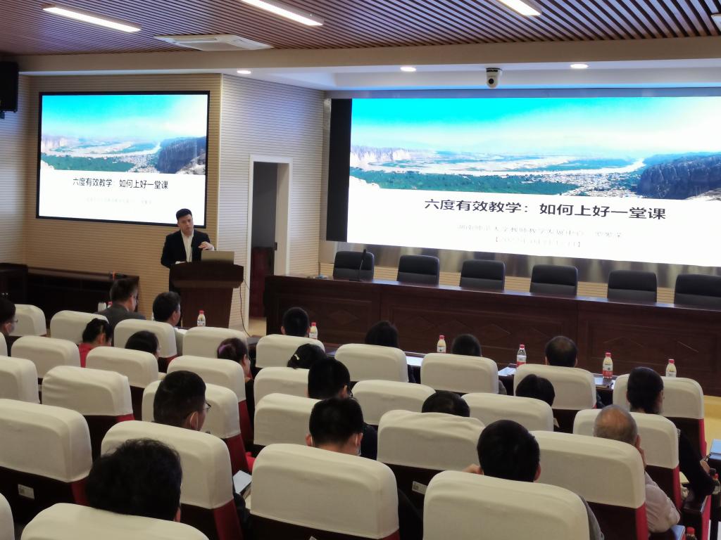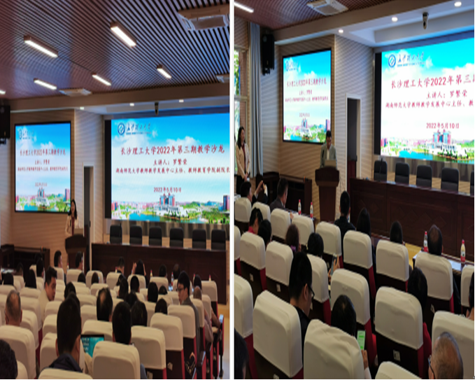 2022年5月10号下午,由教学质量监测与评估中心主办,数学与统计学院承办的MG冰球突破官网2022年第3期教学沙龙在云塘校区理科楼A200举行。本期沙龙主题为“教学竞赛经验研讨与交流”,特邀嘉宾湖南师范大学教师教学发展中心主任、教师教育学院副院长罗繁荣作了题为《六度有效教学:如何上好一堂课》的专题讲座。活动由教学质量监测与评估中心副主任贺晖主持,副主任胡伟、王芳,数统学院党委书记邓崛峰、院长张宏伟、副院长仝青山、王佳伏、李姣、学院全体教师以及来自16个兄弟学院的150余位教师参加了此次活动。