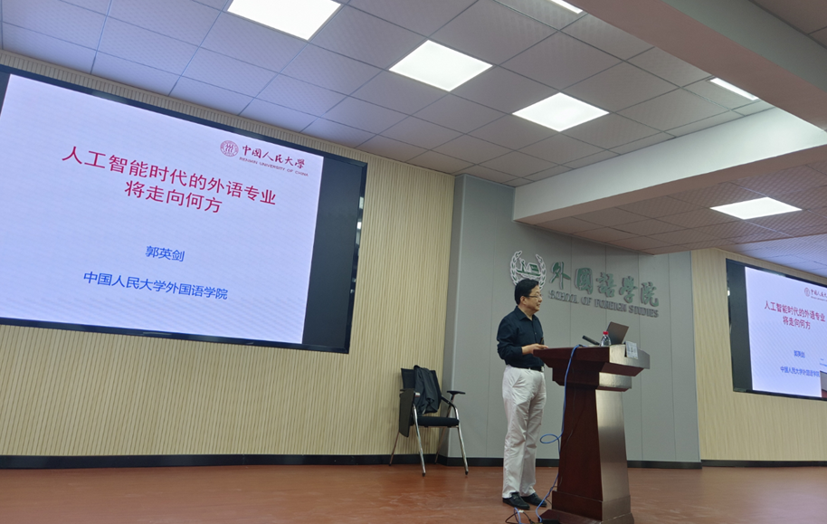 10月13日下午,外国语学院名师专题课暨云影讲坛在MG冰球突破官网金盆岭校区外国语学院三教321报告厅成功举办。此次名师专题课邀请了中国人民大学郭英剑教授为师生作题为“人工智能时代的外语专业将走向何方”的学术讲座。活动由外国语学院院长段胜峰教授主持,近200名师生参加。