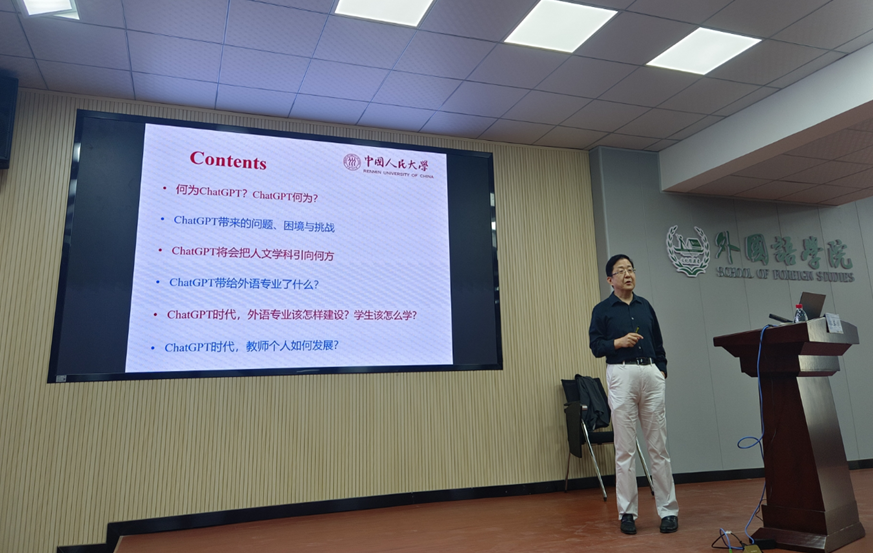 郭教授通过讲述其本人使用ChatGPT的经历和感受,向大家生动地展示了ChatGPT的优缺点,总结了它对于人文学科的影响。而后,郭教授结合ChatGPT的优缺点,提出外语专业学生核心素养的培养应该注重“四个强化”,即强化写作能力、强化思辨能力、强化阐释能力、强化创新意识。并对智能时代教师的发展提出了建议,即主动意识到智能时代的到来,主动掌握其基本技能和基本逻辑,并引导学生在遵从学术伦理的前提下正确使用信息技术。郭教授的讲座内容丰富前瞻、语言生动风趣、引人入胜。在讲座后的师生提问环节,气氛异常活跃,同学们争先恐后地提出自己的疑惑之处,郭教授均耐心细致地回答。