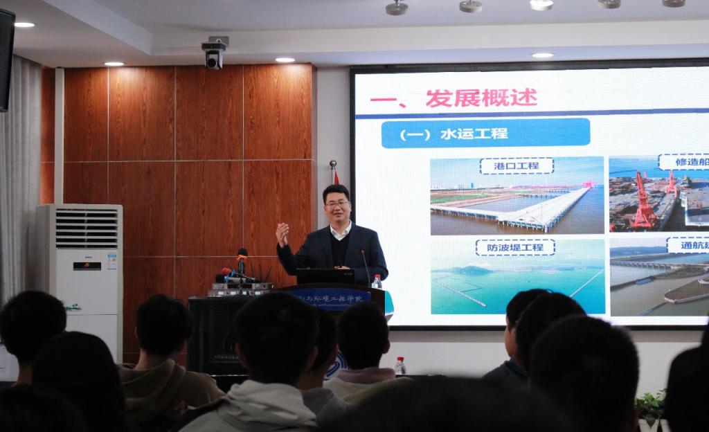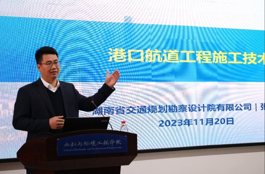 2023年11月20日上午,应MG冰球突破官网水利与环境工程学院邀请,湖南省交通规划勘察设计院有限公司院长张爱平在云塘校区工科三号楼B319为MG冰球官网师生进行题为“港口航道工程施工技术与水运工程智慧化”的通识教育讲座和经验分享交流会。会议由水利学院盛丰副院长主持,100余名师生参会。