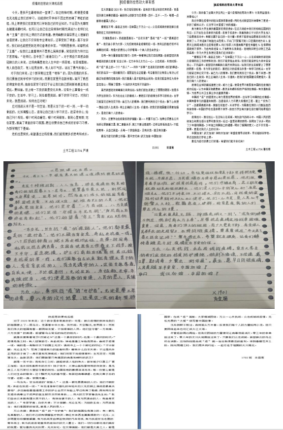 直播课上我院学生认真聆听,仔细学习,深受鼓舞。这是一次特殊的思政课堂,教授们的精彩讲述,充分激发了继教学子的爱国热情和作为青年一代的责任担当。土木1704班的曹彤博感悟道,“经过这堂思政课的教导,我明白了少年强则国强,少年独立则国独立的道理,明白了爱国的意义。这不仅仅是一堂课,更是对我们人生的引领”。1901班的陈建衡感慨道,“作为社会主义的接班人,要把这次的疫情当作学习的机会,学习前辈们处变不惊,舍己为人的精神。我们要利用好这个机会,静下心来想一想自己的人生规划,把我们的祖国建设得更加强大,是我们每个人的使命。”还有很多同学对中央财经大学冯秀军教授提到的此次战疫里90后、00后的“非典型”青春;卖萌不影响冲锋,即使恐惧仍勇敢,“崩溃”之后继续战斗等等印象深刻、深有感触。纷纷表示自己也要向这些哥哥姐姐们学习,关键时刻敢挑重担,用行动谱写新时代的最美青春。(文、图/刘卓明 审/方碧波)