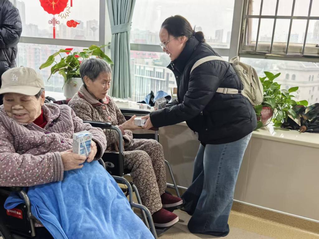 活动伊始,志愿者们带着精心准备的牛奶、纸巾、牙膏等生活慰问品抵达福利院。这些物资承载着学院师生对老人们满满的关爱,特别是为本季度即将过生日的老人们送上了真挚的生日祝福。