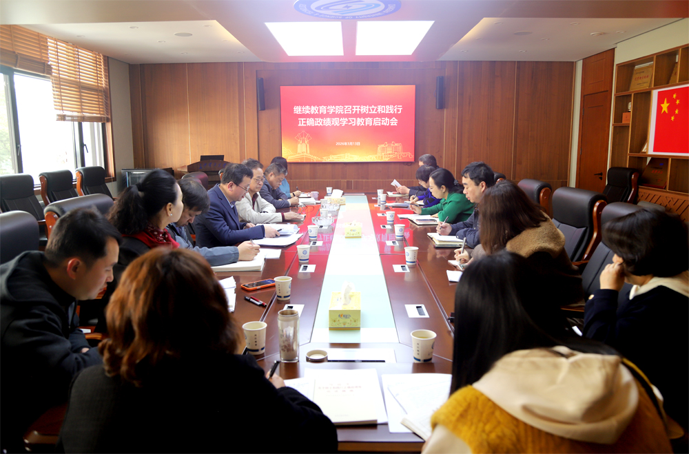 2026年3月13日上午,继续教育学院在15教四楼会议室召开树立和践行正确政绩观学习教育启动会。学院全体党政领导班子成员、各部门主任及各党支部书记参加会议。会议由学院党委书记刘思强主持。