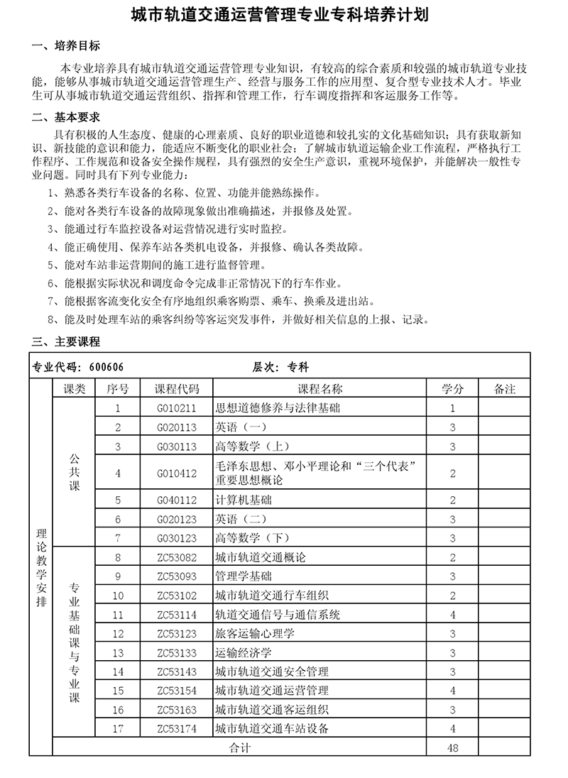 专科培养计划-专业代码:600606 城市轨道交通运营管理专业