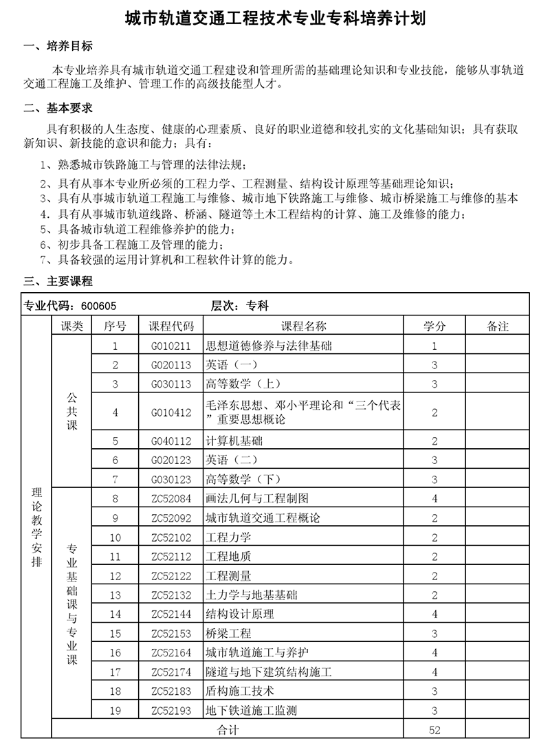 专科培养计划-专业代码:600605 城市轨道交通工程技术专业