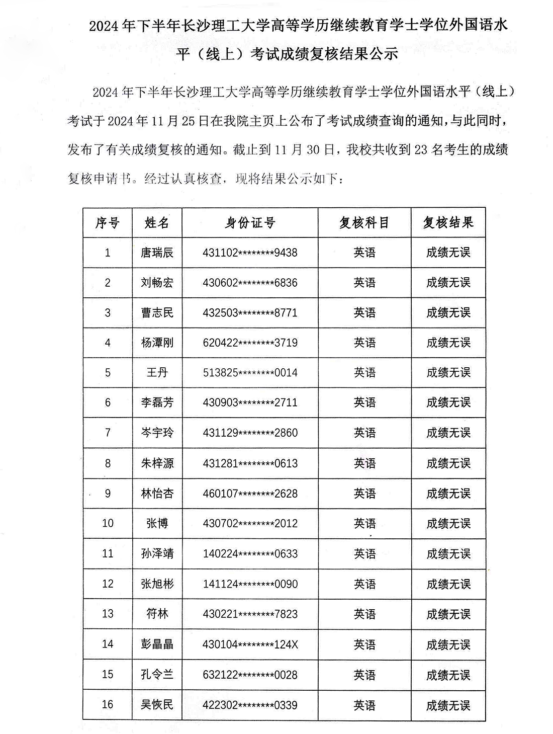 2024年下半年学士学位外国语水平(线上)考试成绩复核结果公示