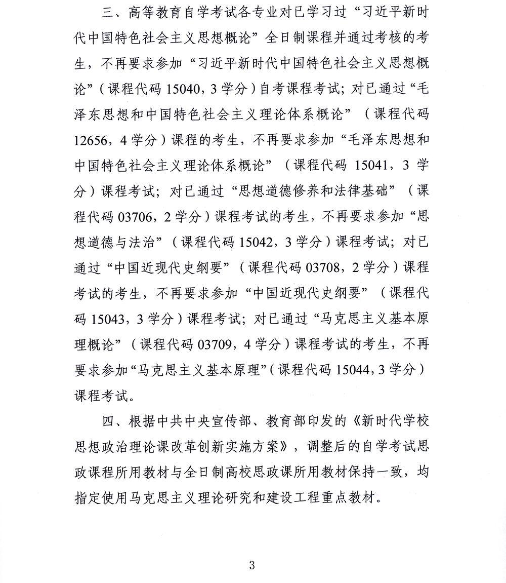 关于调整高等教育自学考试思想政治理论课课程设置的通知