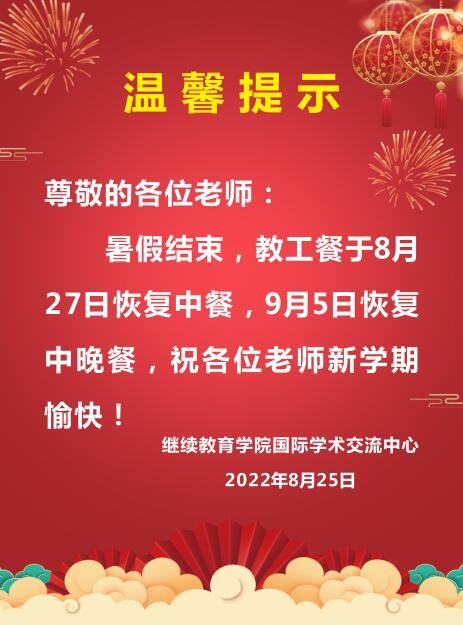 暑假结束,教工餐于8月27日恢复中餐,9月5日恢复中晚餐,祝各位老师新学期愉快!