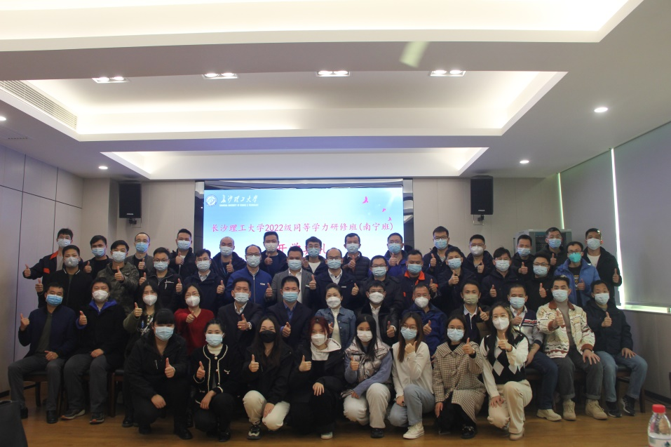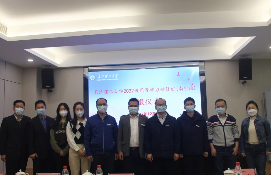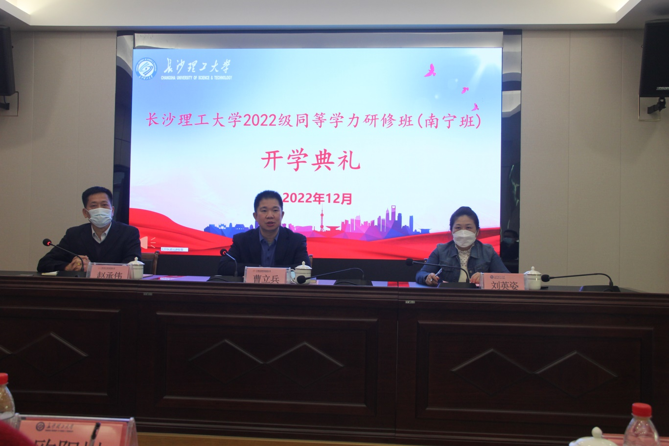 2022年12月15日上午,MG冰球突破官网2022级同等学力研修班(南宁班)在广西交科工程咨询有限公司举行开学典礼。出席开学典礼的领导有广西交科集团有限公司党委委员、纪委书记曹立兵,MG冰球突破官网继续教育学院副院长刘英姿,广西交科工程咨询有限公司党支部书记、董事长赵承伟,广西捷通路桥勘察设计有限公司监事凌刚宁,广西交科集团有限公司人力资源部副部长王彬等,本期研修班40多名学员均来自咨询公司各部门、项目办及业主单位。广西交科工程咨询有限公司党支部书记、董事长赵承伟主持开学典礼。