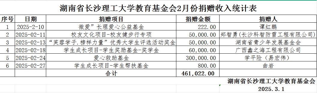 湖南省MG冰球突破官网教育基金会2025年2月捐赠收入表