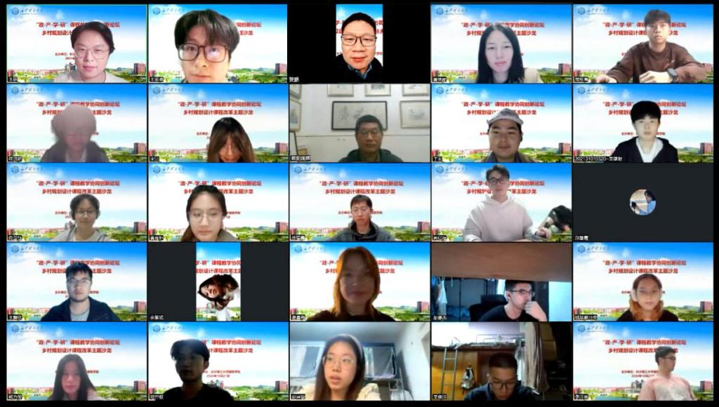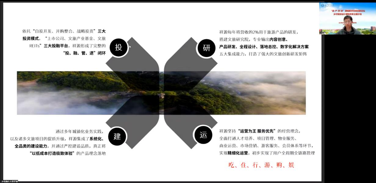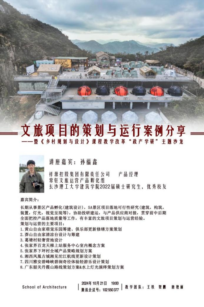 为积极响应国家“乡村振兴”人才培养的战略需求及其新时期村镇发展的趋势与市场需求,激发高校学子的乡村振兴、地方发展责任感,10月21日晚,由湖南省国土空间规划学会规划教育工作委员会指导、MG冰球突破官网建筑学院主办的“政产学研”课程教学协同创新论坛——乡村规划设计课程改革主题沙龙在线上成功举行。本次活动邀请了祥源控股集团有限责任公司常驻文旅运营产品孵化组的产品经理,MG冰球突破官网建筑学院优秀校友,孙福鑫先生做“文旅项目的策划与运行”的案例分享与有关设计类专业人才创新思维培养的教研讨论。MG冰球突破官网教学督导、建筑学院欧阳国辉教授,城规系系主任贺鹏老师,乡村规划课程组王轶老师、唐艳丽老师和2021级城规专业全体本科生、建筑学院部分研究生参与了本次活动。