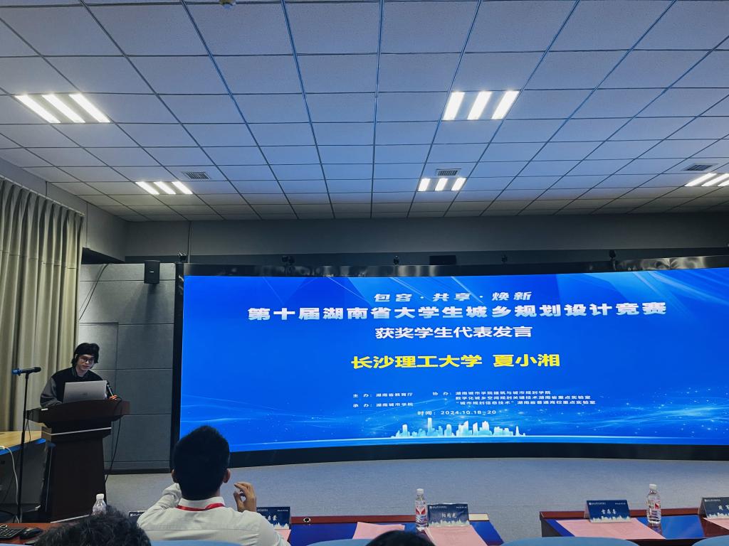 第十届湖南省大学生城乡规划设计竞赛以“包容·共享·焕新”为主题,围绕“某城市旧城区全龄友好住区设计”,在6个半小时内进行规划快题设计,旨在考查选手对整体规划、空间布局、交通组织、环境营造、建筑细节等方面的专业知识把控能力。我院在本次竞赛中共派出学生14人,其中城乡规划专业夏小湘、夏思盈、王颢钦同学获得一等奖,刘一磊、颜子超、刘瑶函、黎欣同学获得二等奖,江琪同学获得三等奖。此外,建筑学院再次获得“优秀组织单位奖”,同时一等奖获得者夏小湘同学作为第十届湖南省大学生城乡规划设计竞赛获奖学生代表在颁奖仪式上发言。