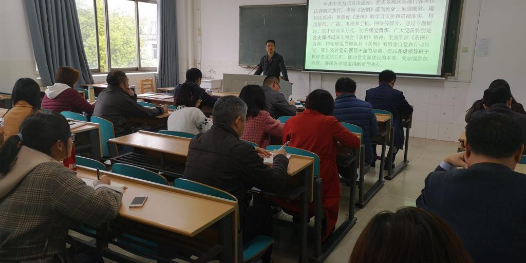 随后,学院特邀党建组织员毛光华主讲了题为《以〈中国共产党支部工作条例〉为基本遵循,全面推进基层党组织“五化”建设》的党课。他从《中国共产党支部工作条例(试行)》主要内容、基层党组织建设的重要性和意义、基层党组织“五化”建设的总体要求以及目标任务与标准要求等四个方面进行了阐述和解读。