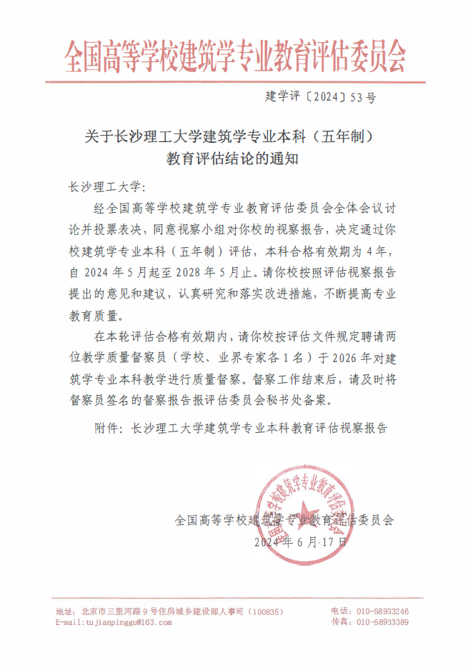 近日,全国高等学校建筑学专业教育评估委员会下发《关于MG冰球突破官网建筑学专业本科(五年制)教育评估结论的通知》(建学评[2024]53号),MG冰球官网建筑学专业本科(五年制)顺利通过专业评估,有效期为4年。