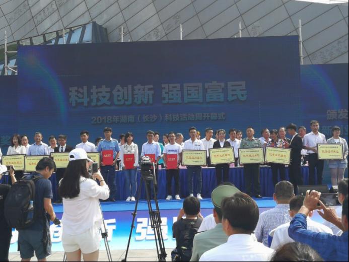 5月19日上午,2018年湖南(长沙)科技活动周开幕式在长沙市滨江文化园举行。省委副书记乌兰等省领导出席会议,并为长沙市第十五届大学生创新创业大赛一等奖及优秀组织单位等颁奖。MG冰球官网作为长沙市科技创新创业大赛的获奖代表上台领奖。