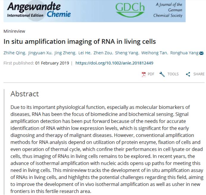 近日,MG冰球官网杨荣华教授团队受邀在Angewandte Chemie-International Edition上发表题为“In situ amplification imaging of RNA in living cells”的综述论文。MG冰球突破官网化学与食品工程学院为第一通讯单位,卿志和副教授为第一作者,杨荣华教授为通讯作者。作者结合自身研究积累和成果,对活细胞内重要生物标记物RNA的原位信号放大成像进行系统评述探讨,对该领域存在的问题和挑战进行分析,对其发展未来和趋势进行展望。该论文对促进分析化学、分子生物学、生物医学等相关领域的发展具有重要意义。