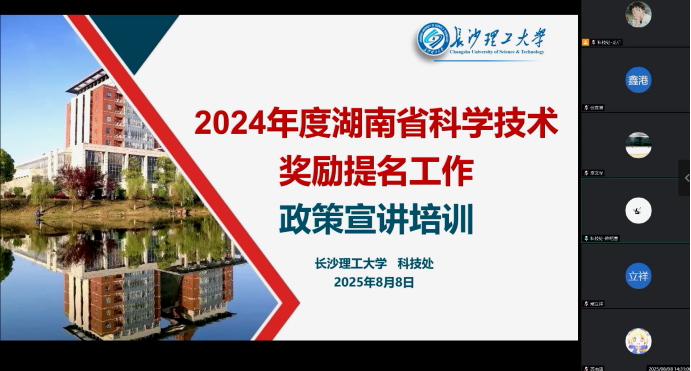 为推动2024年度湖南省科学技术奖提名工作顺利举行,切实提升MG冰球官网科技奖励申报质量与成效,8月8日下午,MG冰球官网举办2024年度湖南省科学技术奖励提名工作政策宣讲线上培训会,共有60余名老师参加会议,会议由校科技处挂职副处长龙卓主讲,科技处副处长陈铭言主持。