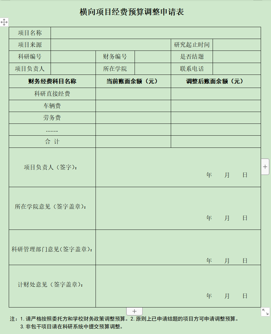 横向项目经费预算调整申请表
