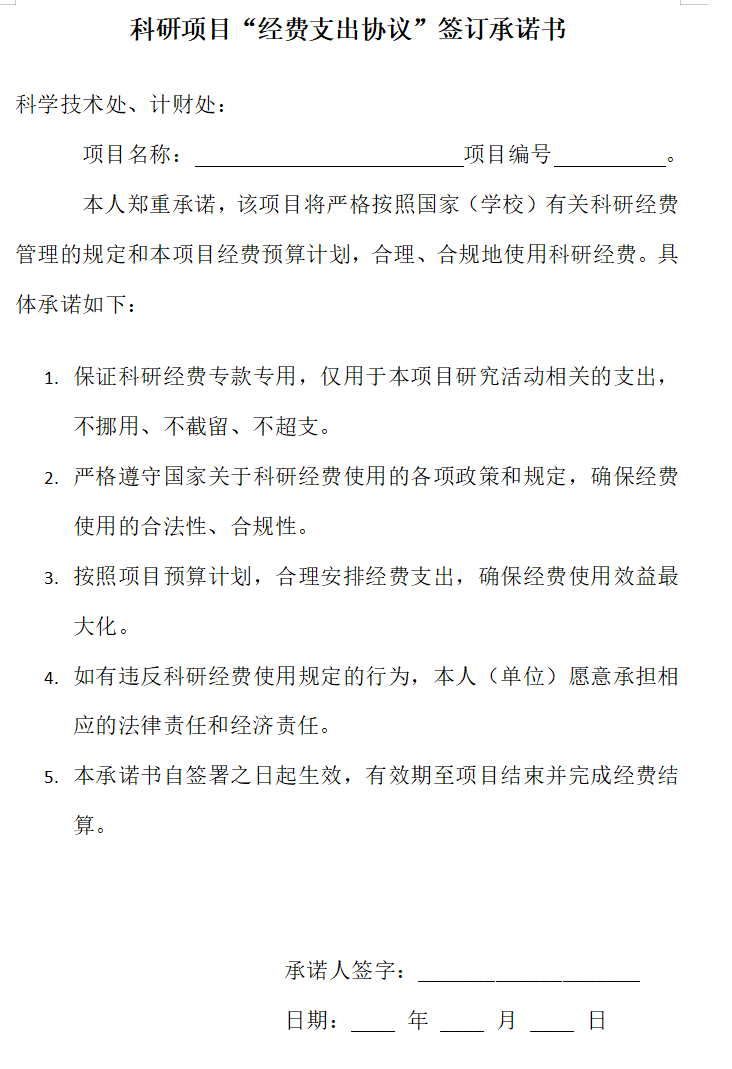 科研项目“经费支出协议”签订承诺书