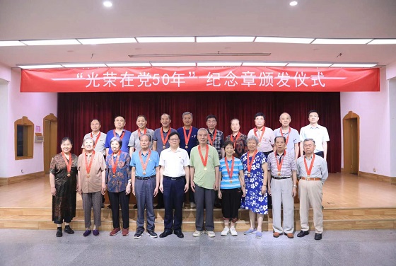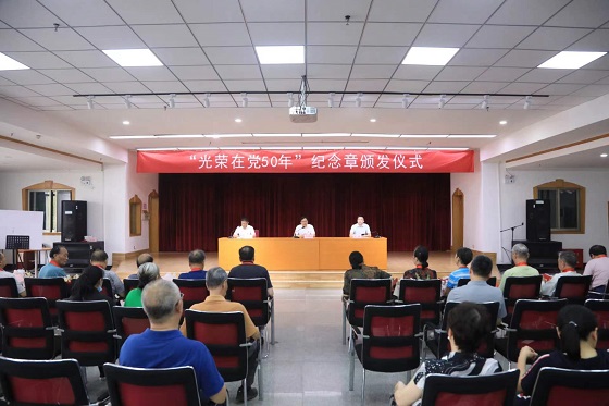 7月5日下午,MG冰球官网在金盆岭校区五教多功能厅举行“光荣在党50年”纪念章颁发仪式,学校党委副书记刘建民、组织部常务副部长陈曦出席仪式,为24名党龄达到50年的老党员颁发纪念章。仪式由离退休教职工党委书记徐亮主持,部分老同志代表和离退休中心科职以上干部参加。