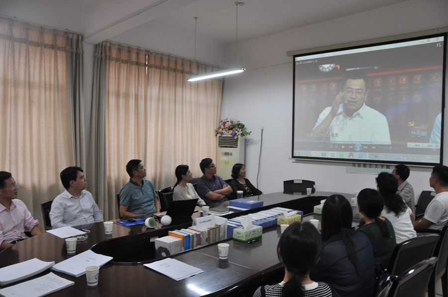 2017年10月10日下午,马克思主义学院教师在云塘校区集中观看了我院蓝茵茵博士参与的理论谈话节目《社会主义“有点潮”》第一集——“乌托邦是个什么岛?”。湖南教育电视台现场采访了同学们的观影感想,并在“教视新闻”中播出。院党委书记易显飞、院长陈万球等领导与老师们一同观看了该节目。